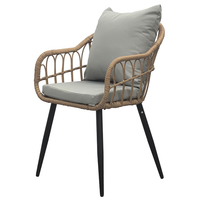 Moderní zahradní židle spojuje stylový design a funkčnost. Je vyrobena z kvalitního polyratanu v přírodní barvě, který zajišťuje odolnost vůči venkovním podmínkám a zároveň přidává židli příjemný přírodní vzhled. Pevná kovová konstrukce dodává stabilitu a spolu s moderním vzhledem se židle skvěle hodí na terasu, zahradu nebo balkon. Díky ergonomickému tvaru poskytuje pohodlné sezení, ideální pro relaxaci nebo posezení u stolu s přáteli.